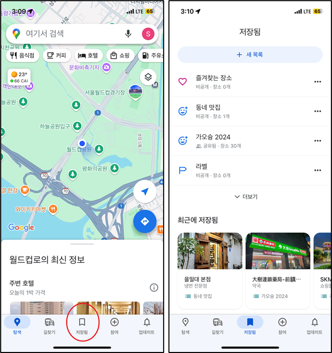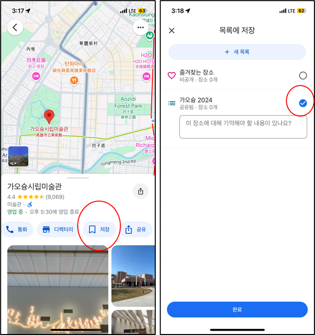 2. 만든 지도에 장소 추가하기: 검색> 저장 > 저장할 목록 선택(중복 선택 가능)> 완료