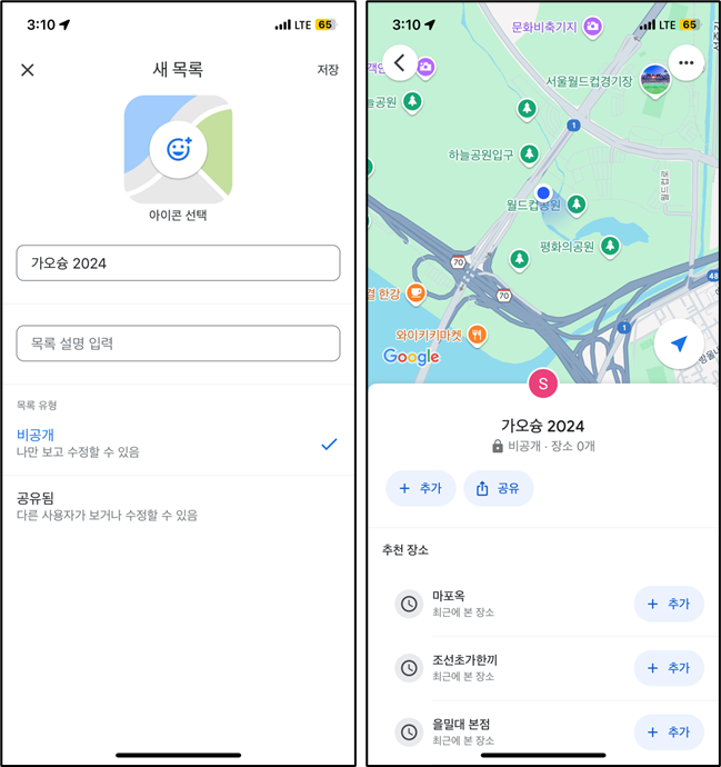 먼저 지도 만드는 방법입니다: 구글맵> 저장됨> +새목록