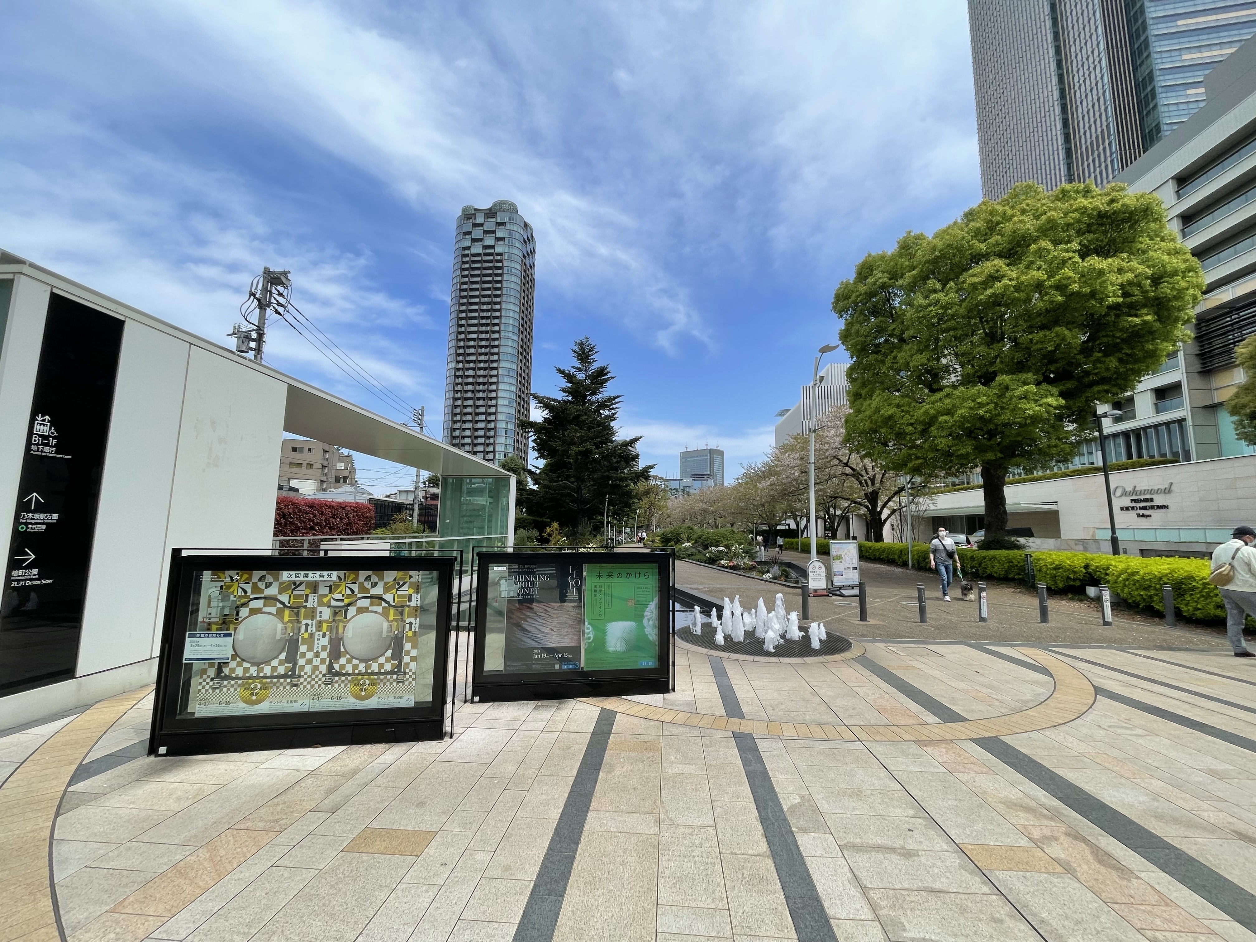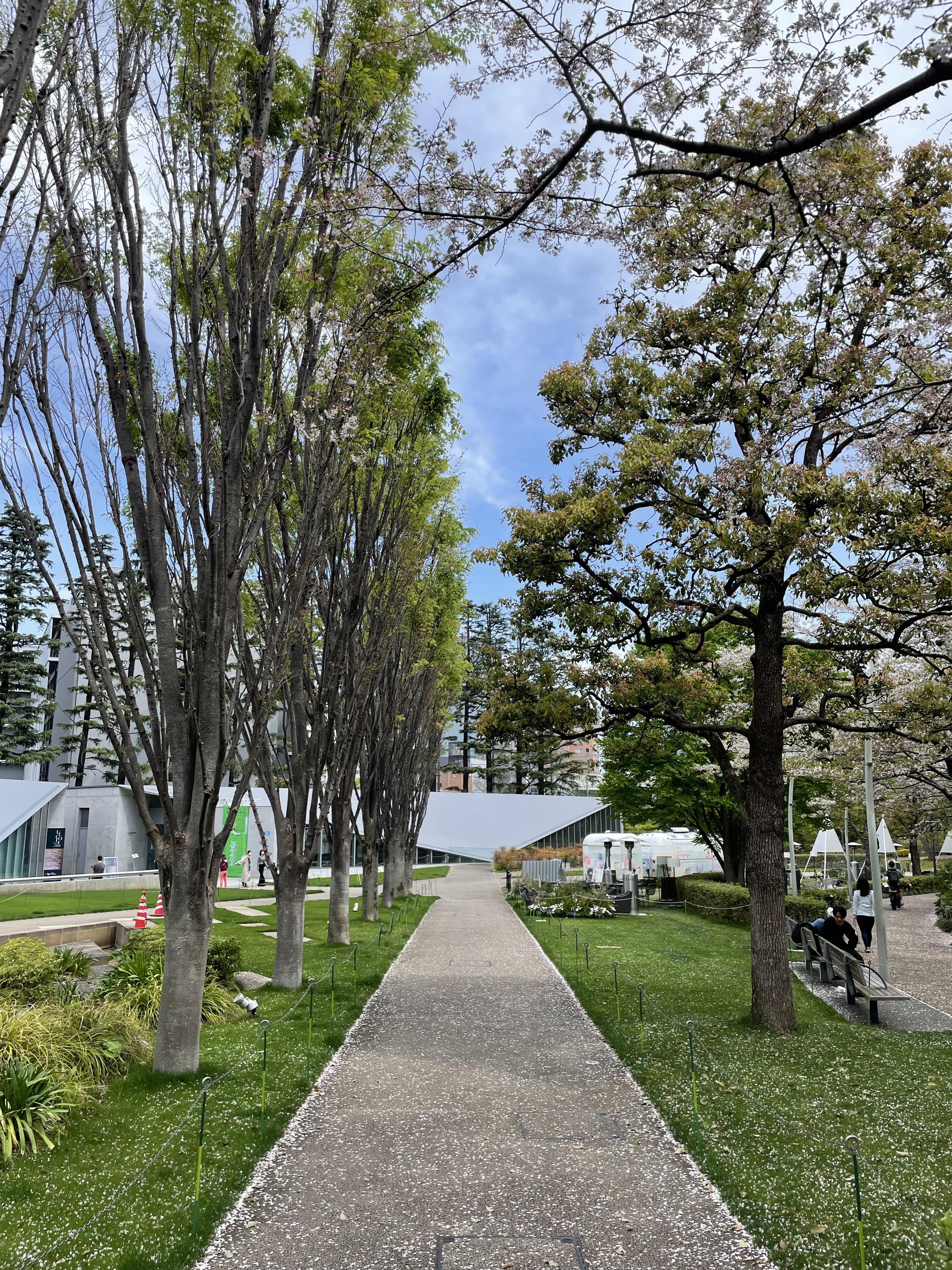 길게 쭉뻗은 산책길을 시작으로, 야외 카페, 21_21 디자인사이트(현대미술관), 넓은 잔디밭, 놀이터와 호수가 있는 공간으로 이어집니다.