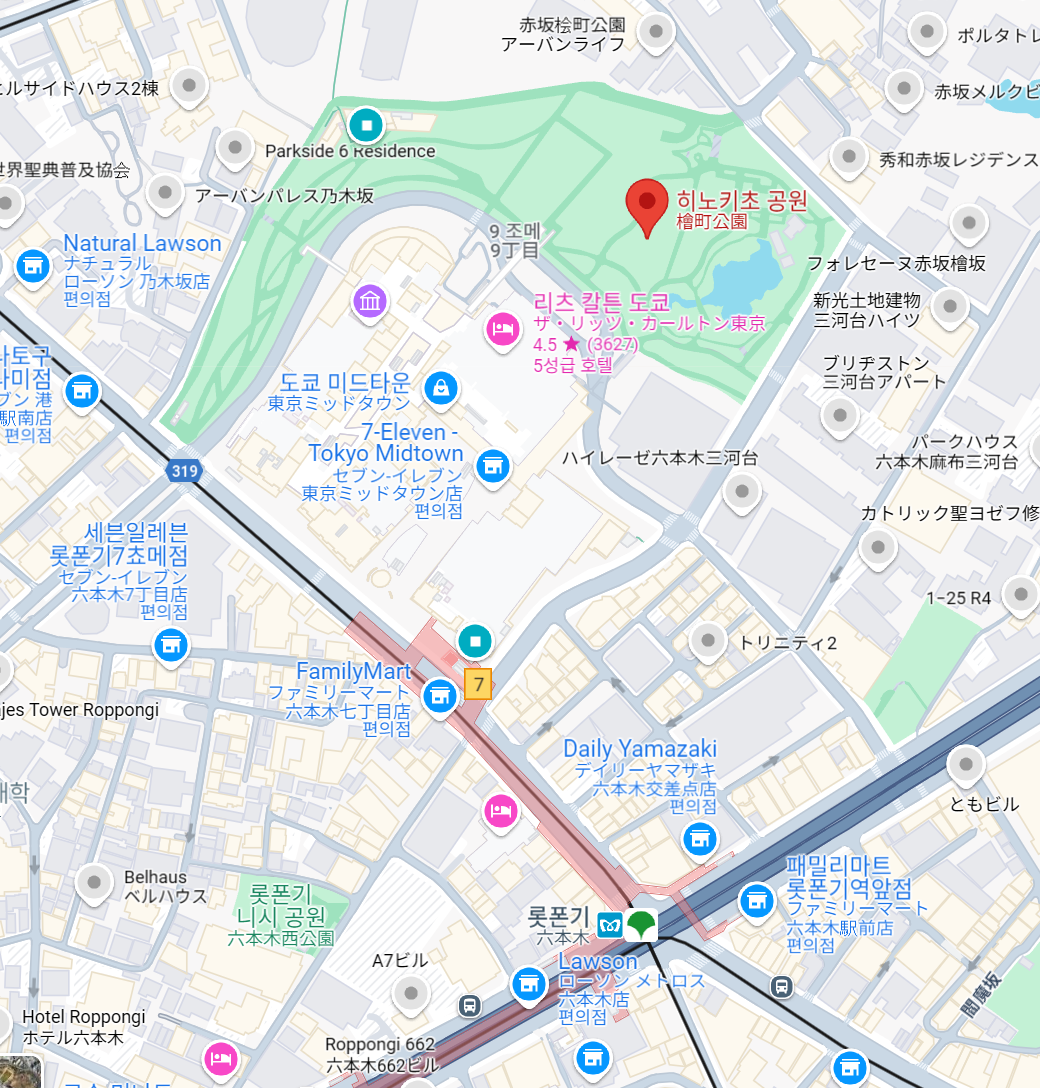 히노키초 공원은 규모가 크지는 않지만 조경이 아주 아름다운 공원으로 롯폰기역 8번 출구에서 걸어서 금방입니다. (체감상 5~10분쯤 걸리는것 같아요)
