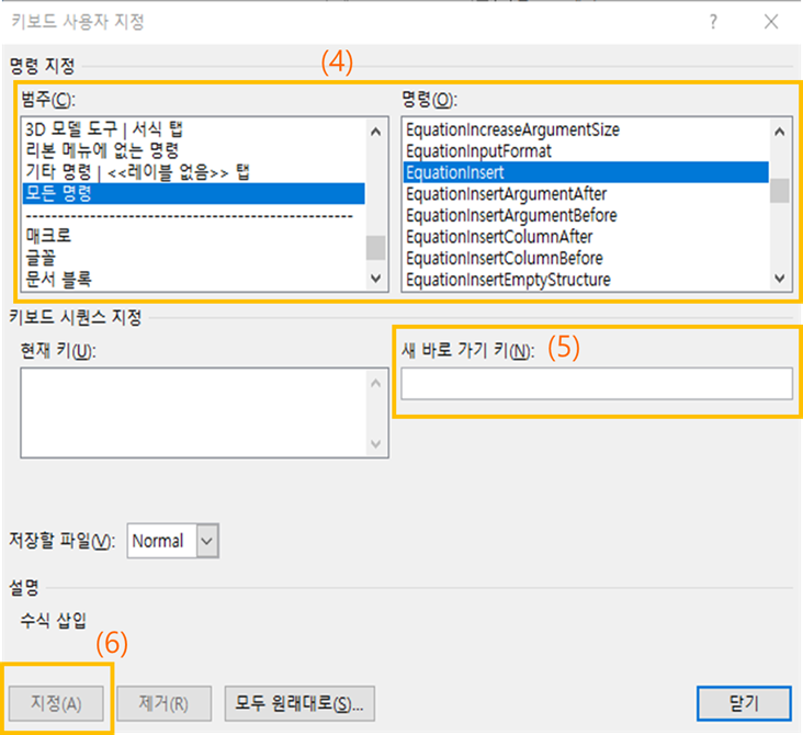 (4) 범주(C) : "모든 명령", 명령(O): "EquationInsert" 선택