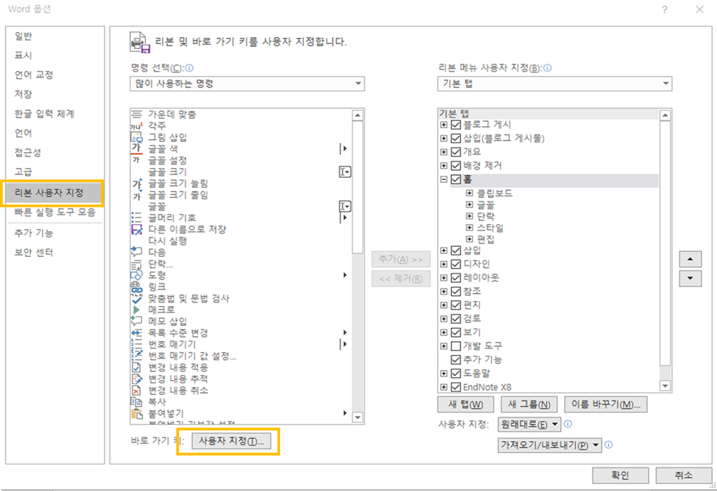 수식 입력을 위한 단축키가 이미 설정되어있는 경우도 있겠지만, 본인이 설정하지 않은 경우에는 설정되어 있지 않겠죠? 단축키를 설정하면 워드 문서 작성을 하다가 마우스로 손이 갈 필요 없이, 바로 키보드만 사용해서 수식을 입력할 수 있으니까 더 편할거예요.