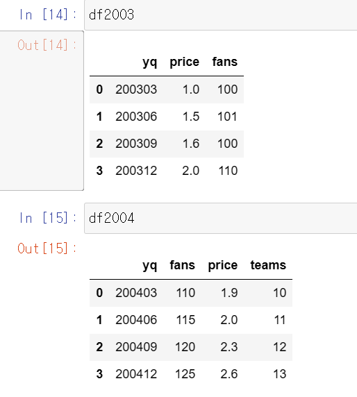 df2004=pd.DataFrame({'yq':[200403,200406,200409,200412], 'fans': [110, 115, 120, 125], 'price': [ 1.9, 2, 2.3, 2.6], 'teams': [10,11,12,13] })