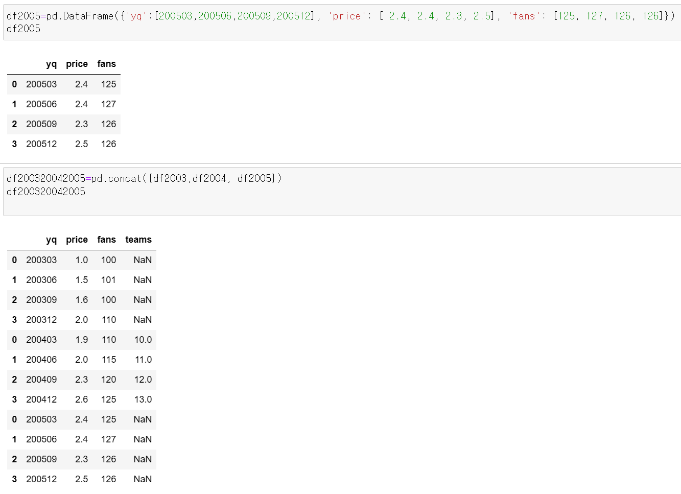 df2003=pd.DataFrame({'yq':[200303,200306,200309,200312], 'price': [ 1, 1.5, 1.6, 2], 'fans': [100, 101, 100, 110]})