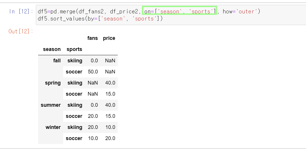 아래 그림에서 각각의 값을 사용했을때 결과의 차이를 확인해보세요. - how=left일 경우 left 데이터프레임 기준이므로 여름,가을,겨울 데이터가 결과 df 에 남게됩니다. right 데이터프레임에는 가을이 없으므로 price 값들은 season=가을인 행에 대해 nan 값이 붙게 됩니다.