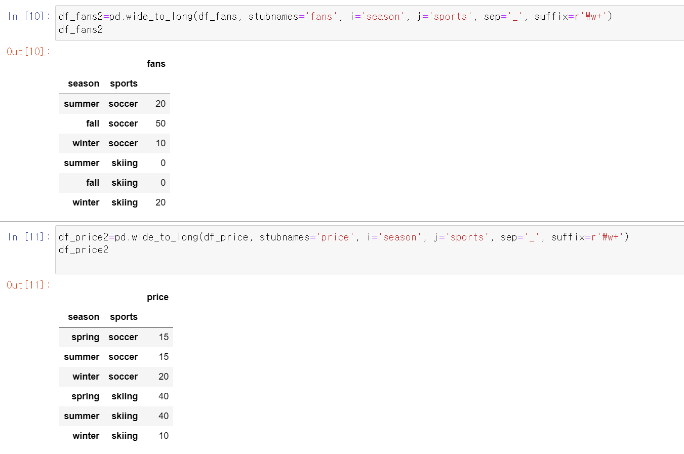 - 위에서 만든 데이터 프레임 두개를 좀 변형했습니다. pd.wide_to_long 을 사용합니다.