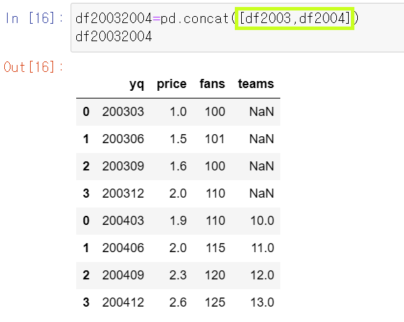 pd.concat을 이용하면 두 데이터프레임을 아래위로 연결해서 price와 fans의 시계열을 길게 이어붙일 수 있습니다.