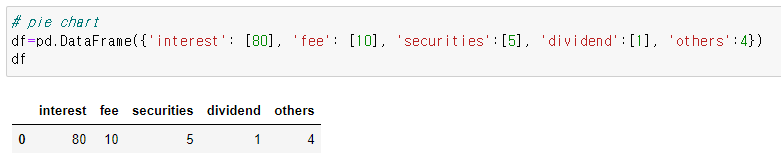 아래와 같이 pandas dataframe 형태로 만들어보았습니다. 가상의 금융기관 수익 구조에 대한 데이터를 만들어보았어요.
