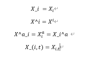 (2)번: X 밑에 하첨자로 i를 붙이고 싶으면 "X_i", X에 상첨자로 i를 쓰고 싶으면 "X^i"를 입력합니다. X에 상첨자 a, 하첨자 i를 쓰고 싶은 경우에는 "X^a_i"를 입력하세요.