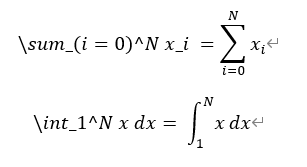 적분의 경우 "backslash" + "int" 를 입력하고 상첨자와 하첨자로 시작점과 끝점을 표현하면 됩니다.