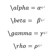 (2)번 방법이 훨씬 쉽고 추천하는 방법입니다. backslash를 입력한 후에 원하는 그리스 문자 이름 (예를 들면 alpha, 또는 beta)를 바로 붙여서 쓰면됩니다.
