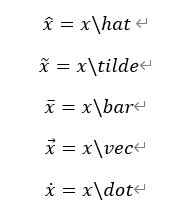 수식을 쓸 때 문자 위에 hat이나 tilde, vector 표시하고 싶을 때는, "해당 문자"+"backslash"+"원하는 엑센트 부호" 순서로 입력해야 합니다. 예를 들면, 이런식입니다.